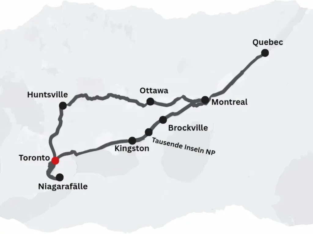 Begleiten Sie uns auf eine Reise voller Weltstädte, Naturwunder und unvergesslicher Momente. Unser Abenteuer startet in Toronto am Ontariosee. Ein Besonderes Highlight: die gewaltigen Niagarafälle. Bei einer Bootsfahrt spüren wir die Kraft des Wassers hautnah – ein Erlebnis fürs Leben. Zurück in Toronto geht’s hoch hinaus: Vom CN Tower genießen wir den Blick über die Skyline. Entlang des Ontariosees fahren wir durch die romantische Flusslandschaft der 1000 Islands am St.-Lorenz-Strom – eine der schönsten Regionen Kanadas. In Québec verzaubern französisches Flair und Kopfsteinpflastergassen. Montréal begeistert mit Lebensfreude, Geschichte und urbanem Puls – ein spannender Kontrast. In Ottawa flanieren wir am Rideau-Kanal vorbei an imposanter Architektur. Danach lockt die Natur: Im Algonquin Provincial Park erleben wir Kanadas wilde Seele – stille Seen, Wälder, Tierwelt. Durch die idyllische Muskoka-Region mit glitzernden Seen führt der Weg zurück nach Toronto – mit Eindrücken, die bleiben.